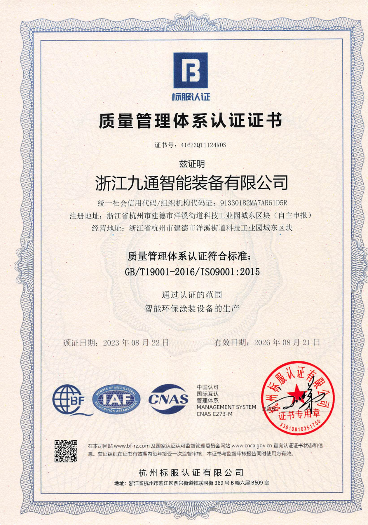 浙江九通智能裝備有限公司簡(jiǎn)稱九通,由“譽(yù)滿九州 廣陌通衢”而來,成立于2011年,專注于智能環(huán)保涂裝整體解決方案系統(tǒng),是一家集咨詢、勘察、設(shè)計(jì)、研發(fā)、生產(chǎn)、銷售、安裝、調(diào)試、交付、運(yùn)維于一體的專業(yè)服務(wù)廠商,研發(fā)總部位于北京,生產(chǎn)基地設(shè)立于浙江、山東、廣東。產(chǎn)品包括涂裝生產(chǎn)線、噴砂房、噴漆房、涂裝機(jī)器人、烤漆房、噴漆烘干一體房、除塵設(shè)備、有機(jī)廢氣處理設(shè)備等,客戶群體包括風(fēng)電、軌道交通、航空航天、專用車、汽車、結(jié)構(gòu)件、石油裝備、工程機(jī)械、礦工機(jī)械等領(lǐng)域,項(xiàng)目經(jīng)驗(yàn)豐富!